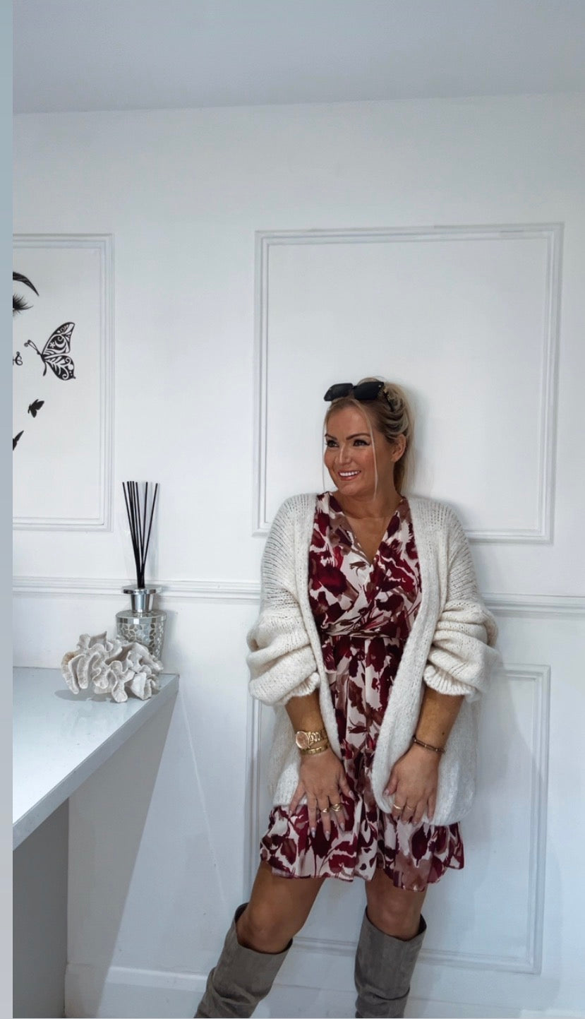 Gorgeous print short dress , elasticated waist and cuff for maximum comfort. Faux wrap style burgundy colour way
